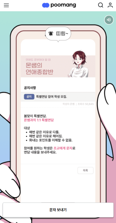 몬쌤의 연애종합반 공지사항도 나와있으며, 1:1 특별면담도 가능하네요.