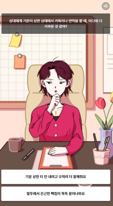 상대에게 기분이 상한 상태에서 카톡이나 연락을 할 때, 어디에 더 가까운 것 같은지 물어봅니다.