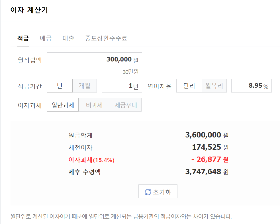 적금은 최대 30만 원씩 1년 납입 시 받을 수 있는 금액입니다.