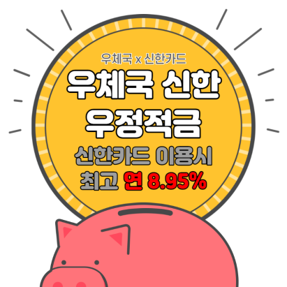 우체국을 이용하면서 신한카드를 사용하시는 분들이라면 신한 우정 적금을 하여 연 8.95% 혜택을 받을 수 있습니다.
