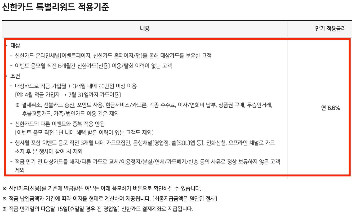 → 특별리워드를 받기 위해서는 신한카드 대상카드로 실적 조건을 충족하시면 만기 혜택이 제공됩니다.