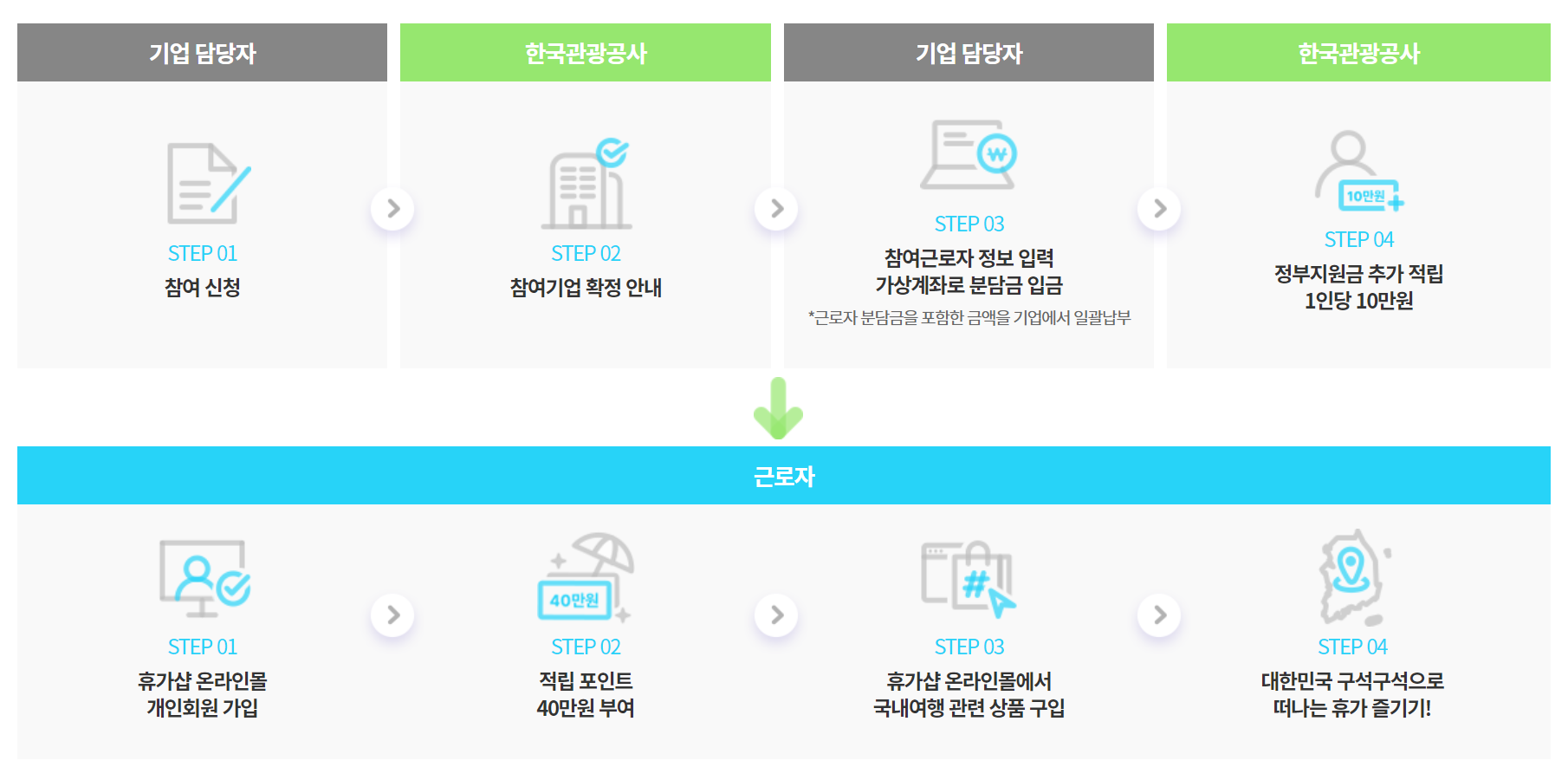 : 직장 내에서 자유로운 휴가문화 조성을 위하여 기업과 정부가 근로자의 여행경비를 지원해주는 복지제도입니다. 근로자는 40만원의 적립 포인트로 국내여행 온라인몰에서 사용하실 수 있습니다. 매년 실시하고 있는 근로자 휴가지원사업을 통해서 근로자 삶의 질 향상 등으로 근로자의 만족도가 매우 높은 사업입니다.