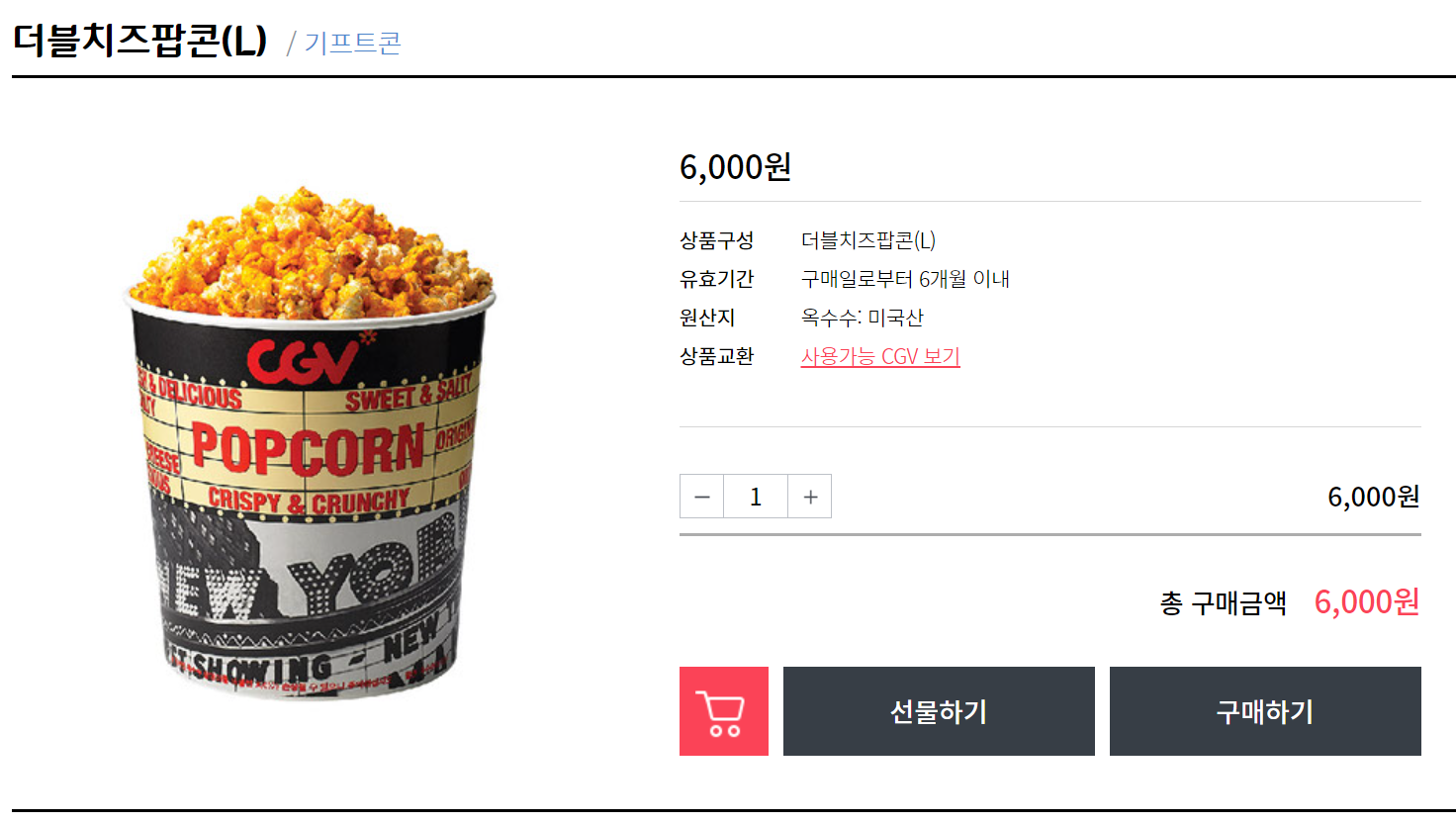 3. 더블치즈팝콘 - 가격은 6,000원이며, L(라지) 사이즈입니다. M(중간) 사이즈는 5,500원입니다. (더블치즈팝콘은 치즈매니아들이라면 놓칠 수 없는 팝콘이며, 치즈의 짭짤한 맛을 좋아하시는 분들에게 추천해드릴 만한 팝콘입니다.)