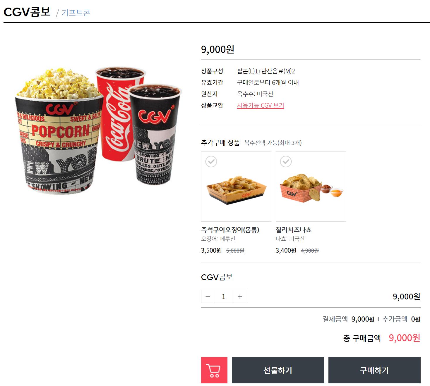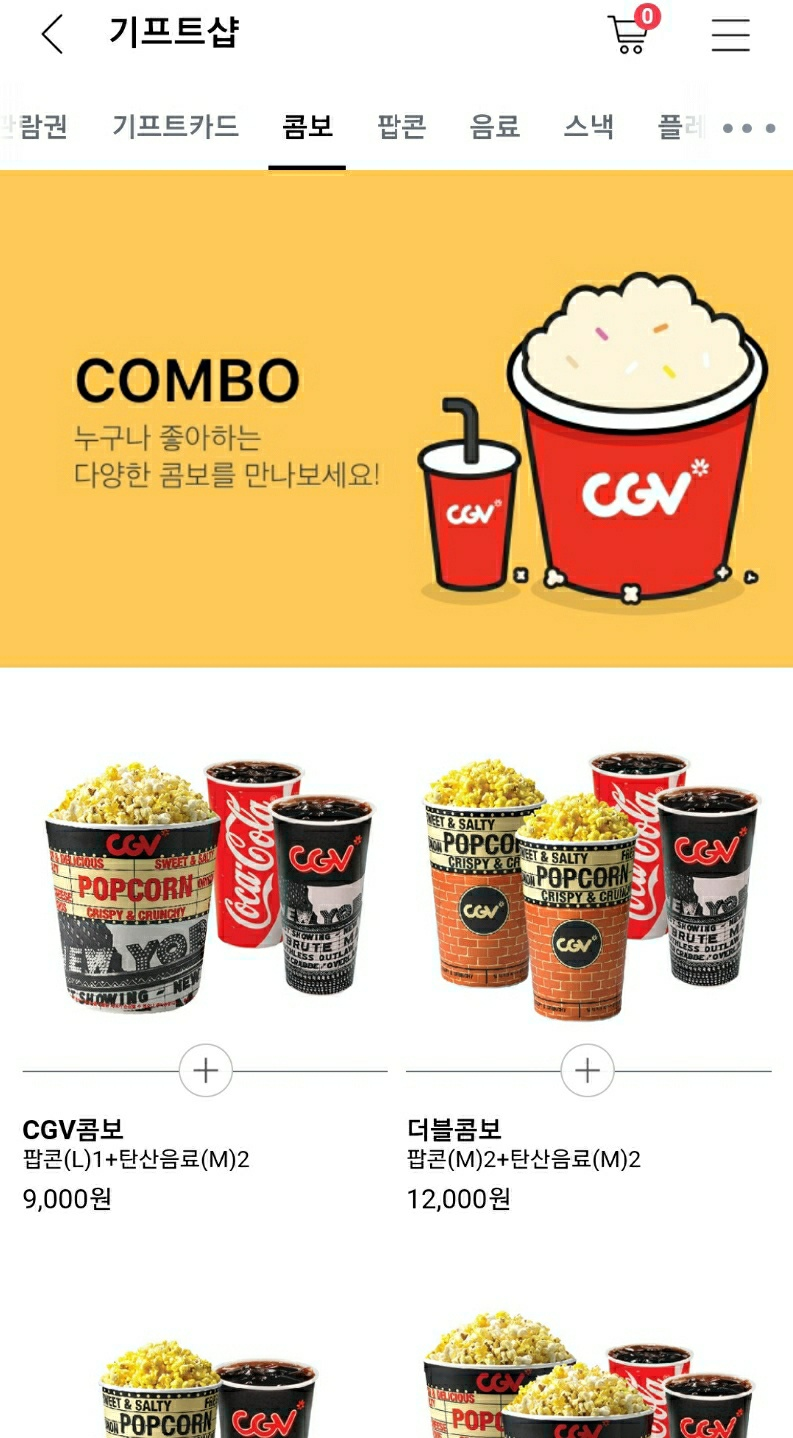 1. CGV 콤보 - 가격은 9,000원이며, 팝콘(L) 큰 사이즈 1개이며, 탄산음료(M) 중간 사이즈 2개입니다. 팝콘과 탄산음료 종류는 선택하실 수 있습니다.