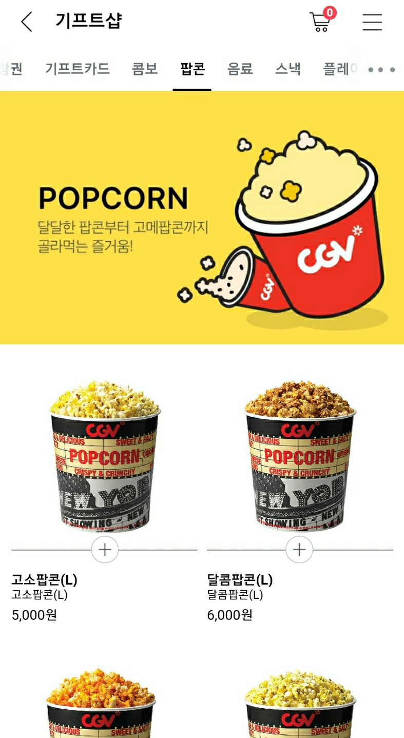 모바일 CGV 어플(앱)에서의 팝콘 메뉴 추천과 가격은 다음과 같습니다.
