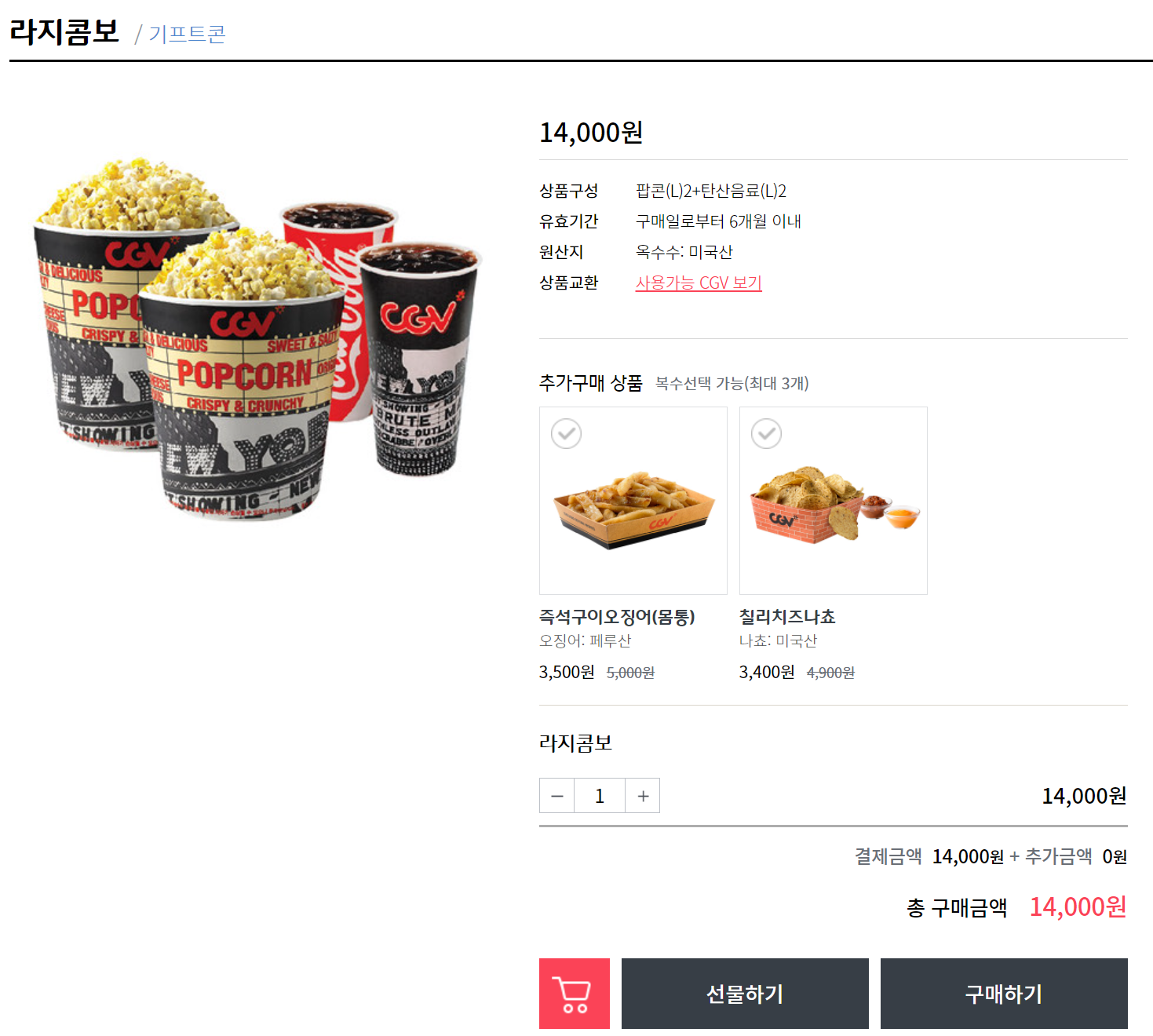 4. 라지콤보 - 가격은 14,000원이며, 팝콘(L) 큰 사이즈 2개이며, 탄산음료(L) 큰 사이즈 2개입니다. 팝콘 종류 2가지 선택하실 수 있으며, 탄산음료 종류는 선택하실 수 있습니다.