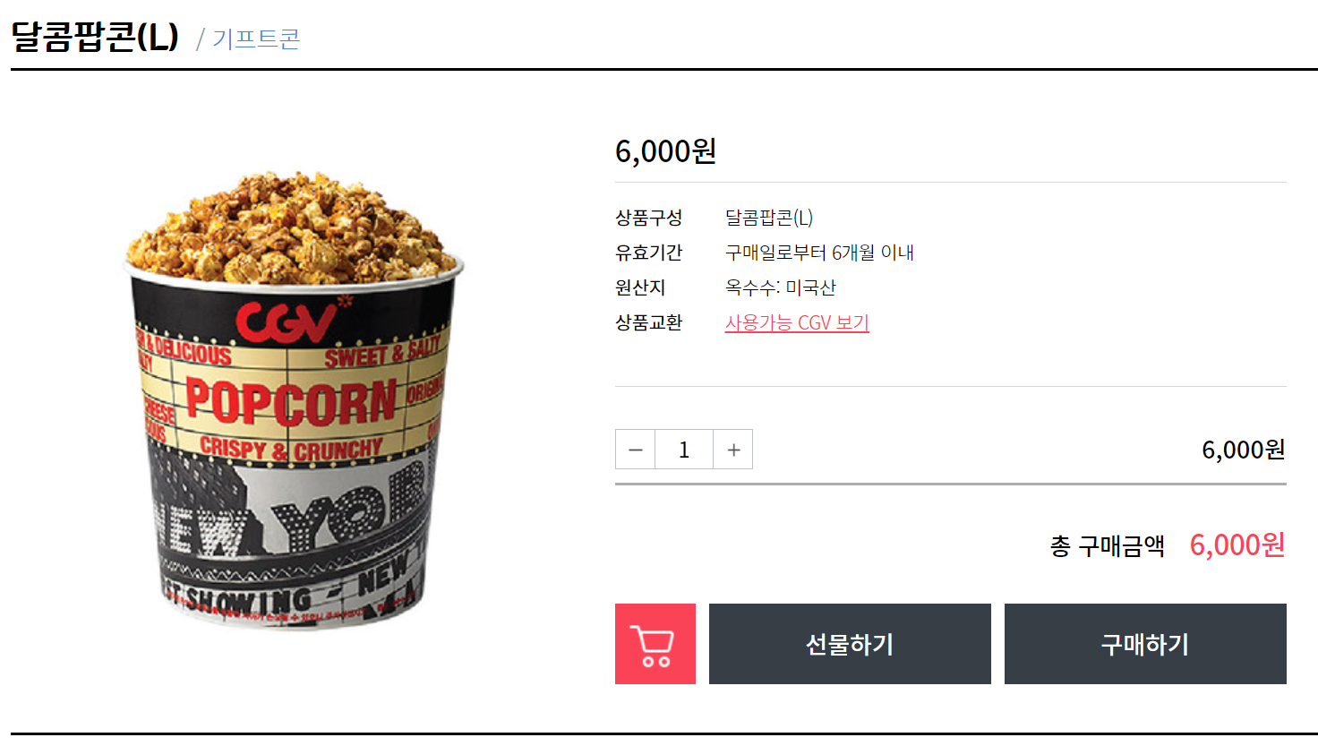 2. 달콤팝콘 - 가격은 6,000원이며, L(라지) 사이즈입니다. M(중간) 사이즈는 5,500원입니다. (달콤팝콘은 달콤한 카라멜 향이 가득한 달콤팝콘이며, 달콤한 것을 좋아하시는 분들에게 추천해드릴 만한 팝콘입니다.)