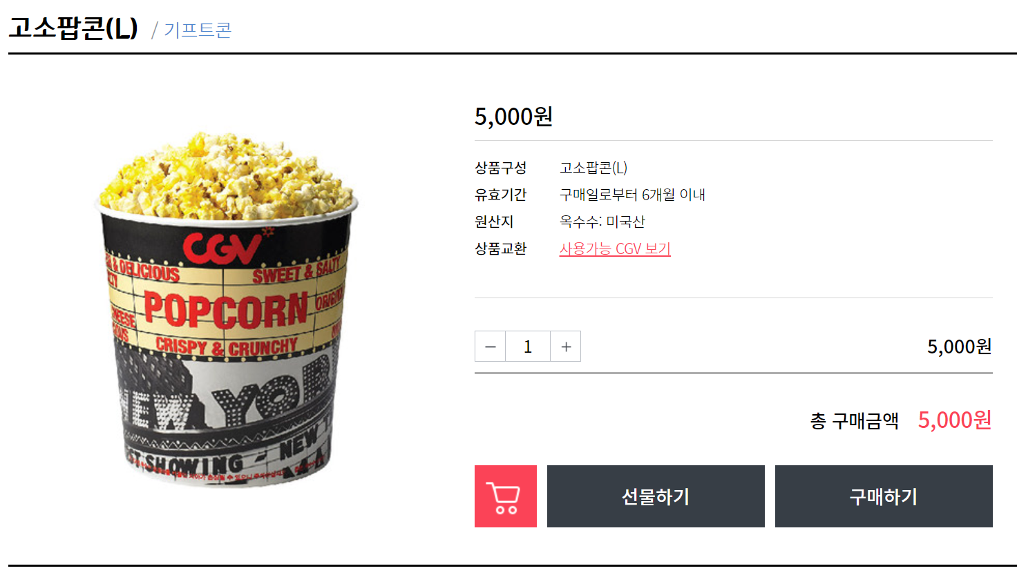 1. 고소팝콘 - 가격은 5,000원이며, L(라지) 사이즈입니다. M(중간) 사이즈는 4,500원입니다. (고소팝콘은 옥수수 본연의 맛을 즐길 수 있는 짭짜름한 클래식 고소팝콘 누구나 좋아할 만한 팝콘입니다.)