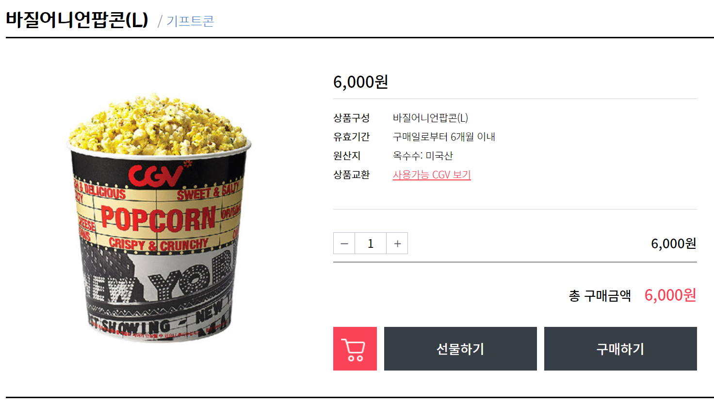 4. 바질어니언팝콘 - 가격은 6,000원이며, L(라지) 사이즈입니다. M(중간) 사이즈는 5,500원입니다. (바질어니언팝콘은 수많은 매니아를 보유한 바로 그 팝콘이며, 계속 먹게 되어서 중독성 강하다고 하니 중독성 200%입니다.)