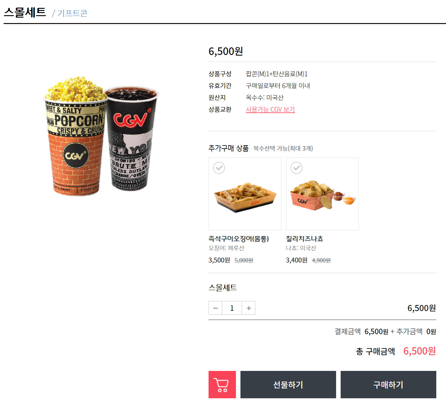 3. 스몰세트 - 가격은 6,500원이며, 팝콘(M) 중간 사이즈 1개이며, 탄산음료(M) 중간 사이즈 1개입니다. 팝콘과 탄산음료 종류는 선택하실 수 있습니다.