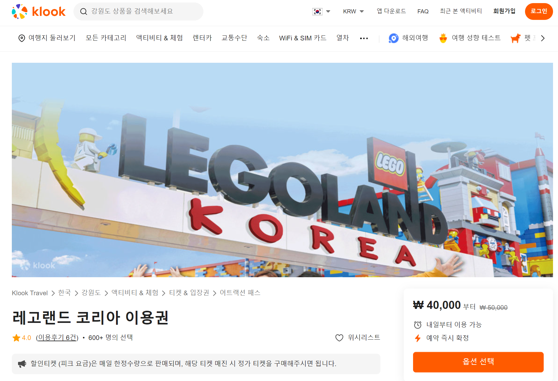 : 아래의 클룩 홈페이지에 방문하시면 레고랜드 입장권을 할인을 받아 예매를 하실 수 있습니다.