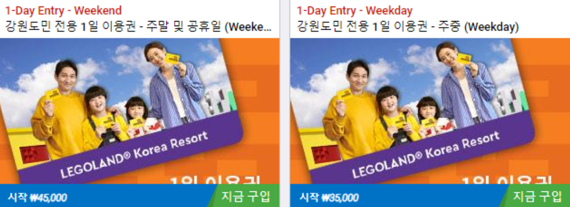 평일 온라인 '레고랜드 코리아 이용권' 가격은 성인-50,000원/어린이-40,000원입니다.