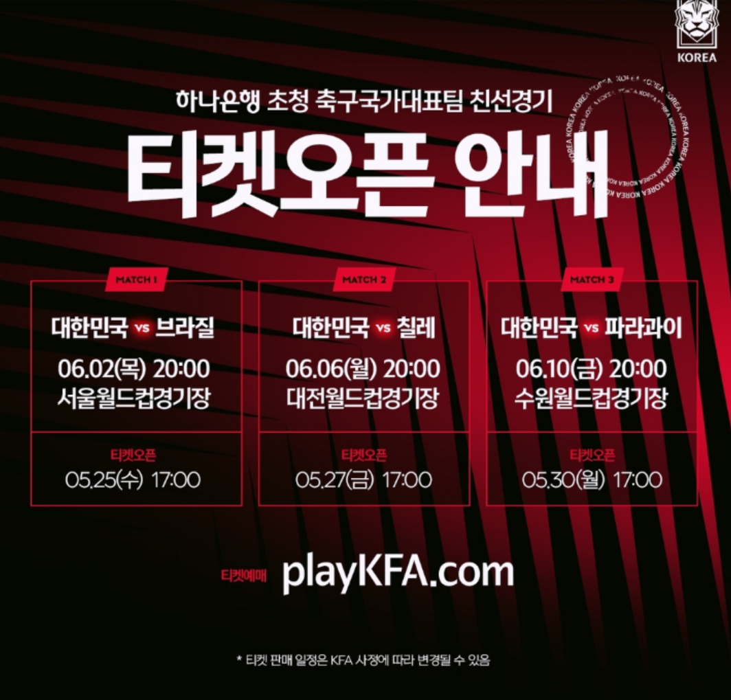 한국 대 브라질 경기 티켓 판매 일정은 2022년 5월 25일 수요일 17:00(오후 5시)입니다.