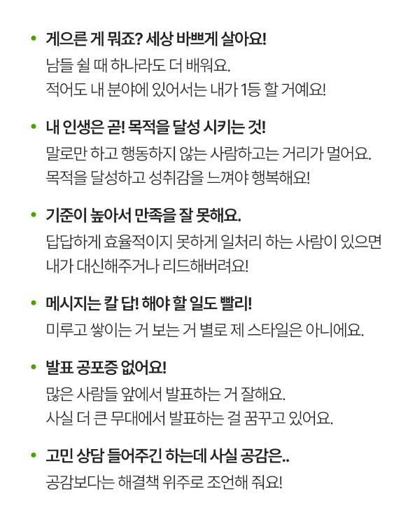 - 기준이 높아서 만족을 잘 못할 때도 있으며, 답답하게 효율적이지 못하게 일처리 하는 사람이 있으면 내가 대신해주거나 리드를 한다고 합니다.