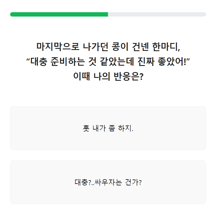 6번. 마지막으로 나가던 콩이 건넨 한마디, "대충 준비하는 것 같았는데 진짜 좋았어!" 이때 나의 반응은?