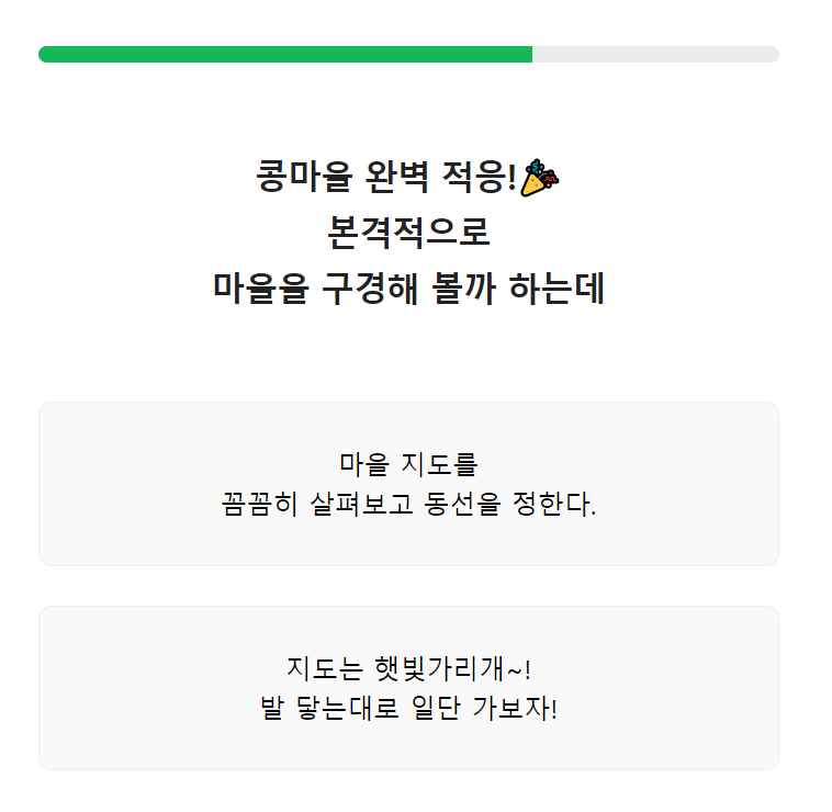8번. 콩마을 완벽 적응! 본격적으로 마을을 구경해 볼까 하는데 나의 행동은?