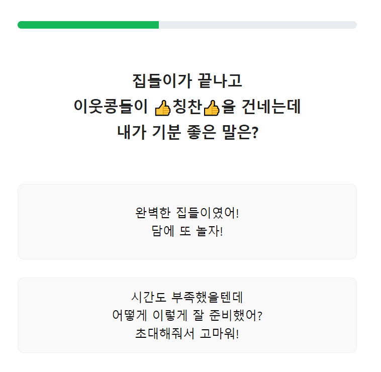5번. 집들이가 끝나고 이웃콩들이 칭찬을 건네는데 내가 기분 좋은 말은?