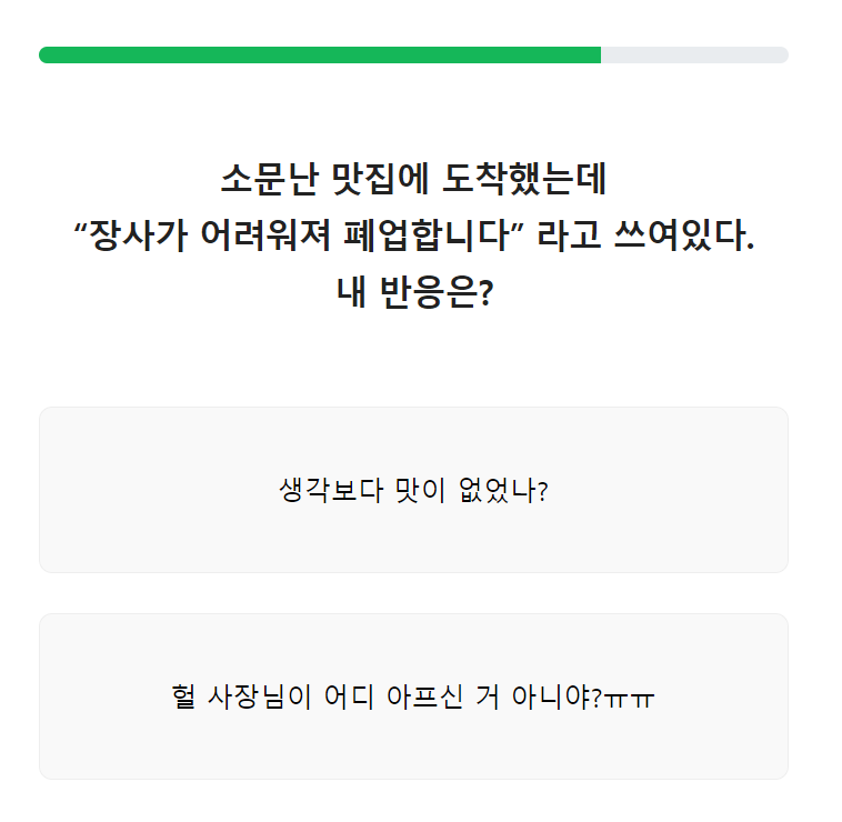 9번. 소문난 맛집에 도착했는데 "장사가 어려워져 폐업합니다"라고 쓰여있다. 내 반응은?