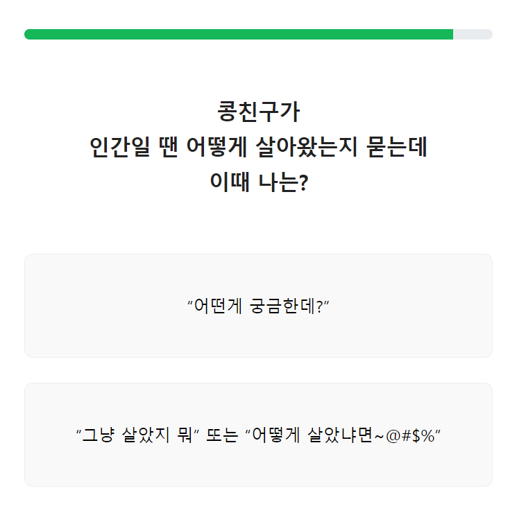 11번. 콩친구가 인간일 때 어떻게 살아왔는지 묻는데 이때 나는?
