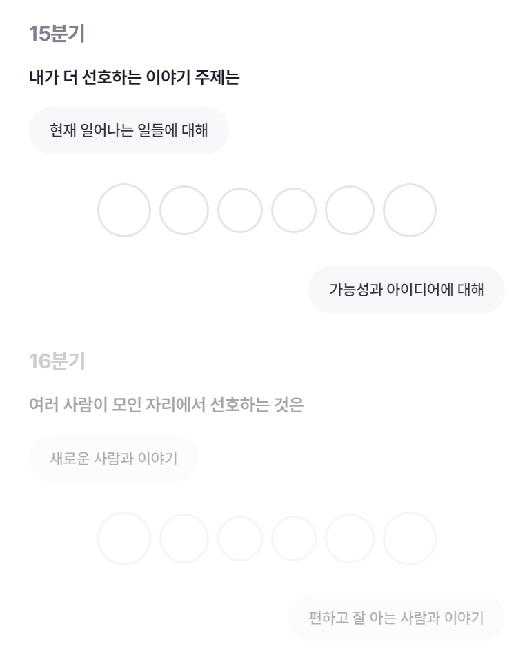 15분기의 문항은 내가 더 선호하는 이야기 주제는? / 16분기의 문항은 여러 사람이 모인 자리에서 선호하는 것은?