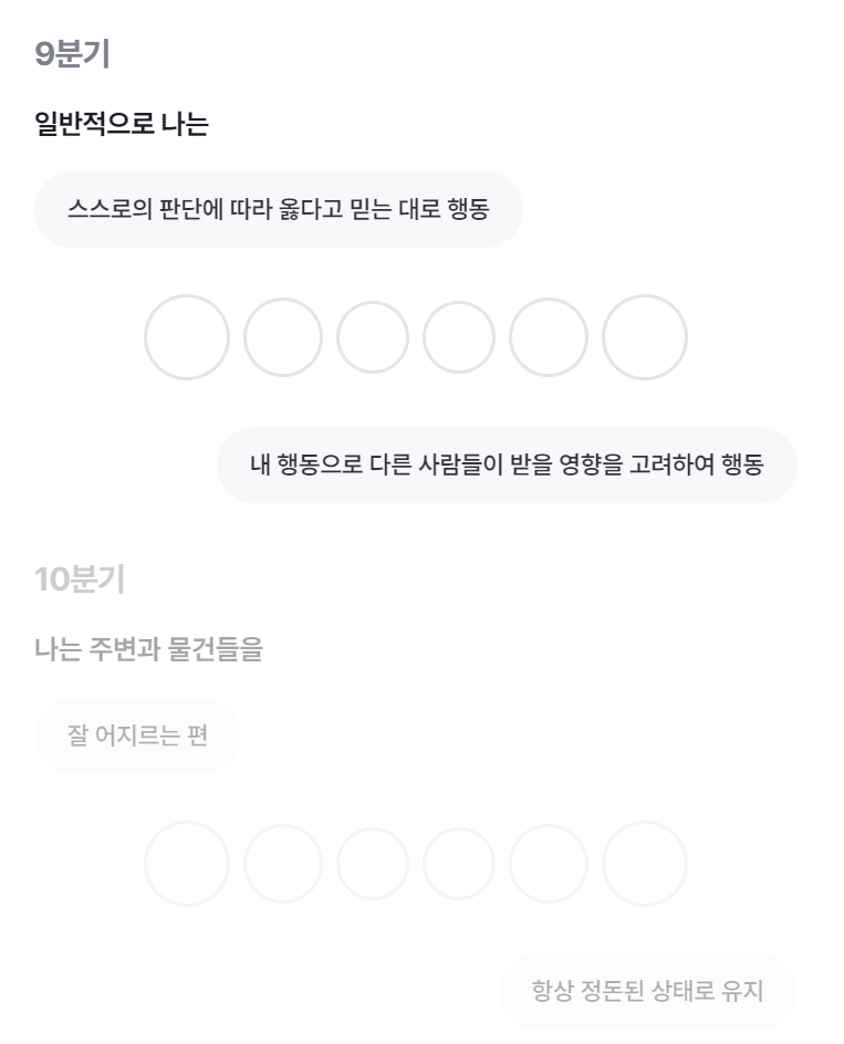 9분기의 문항은 일반적으로 나는? / 10분기의 문항은 나는 주변과 물건들을?