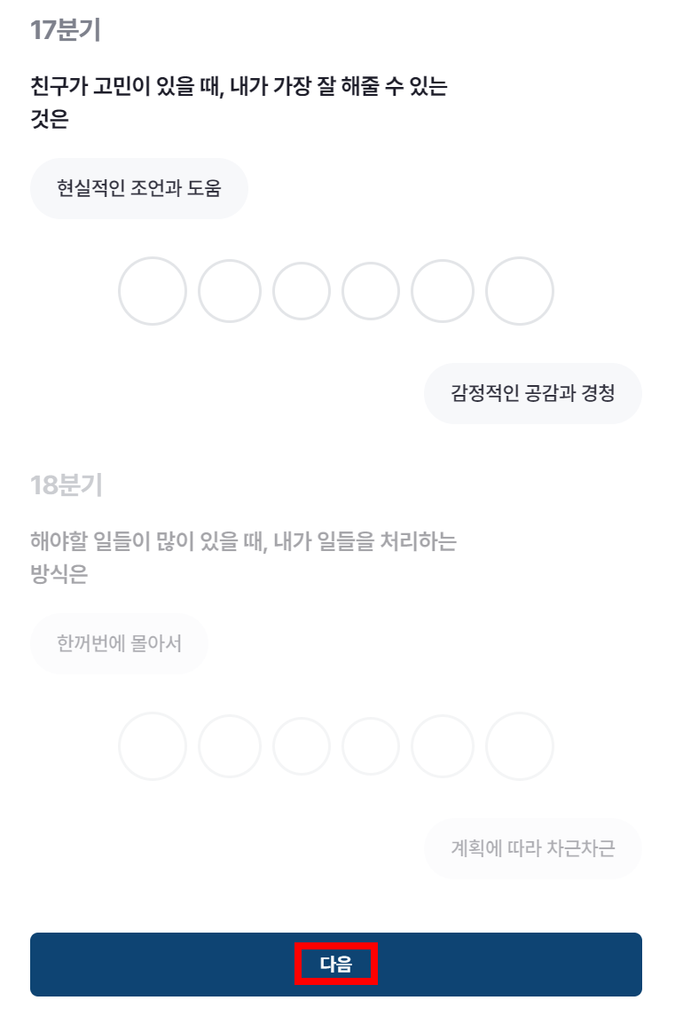 17분기의 문항은 친구가 고민이 있을 때, 내가 가장 잘 해줄 수 있는 것은? / 18분기의 문항은 해야할 일들이 있을 때, 내가 일들을 처리하는 방식은?