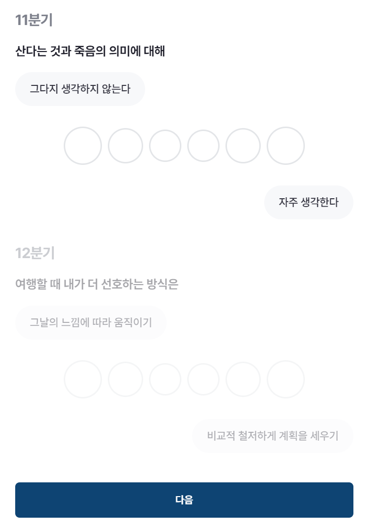 11분기의 문항은 산다는 것과 죽음의 의미에 대해? / 12분기의 문항은 여행할 때 내가 더 선호하는 방식은?
