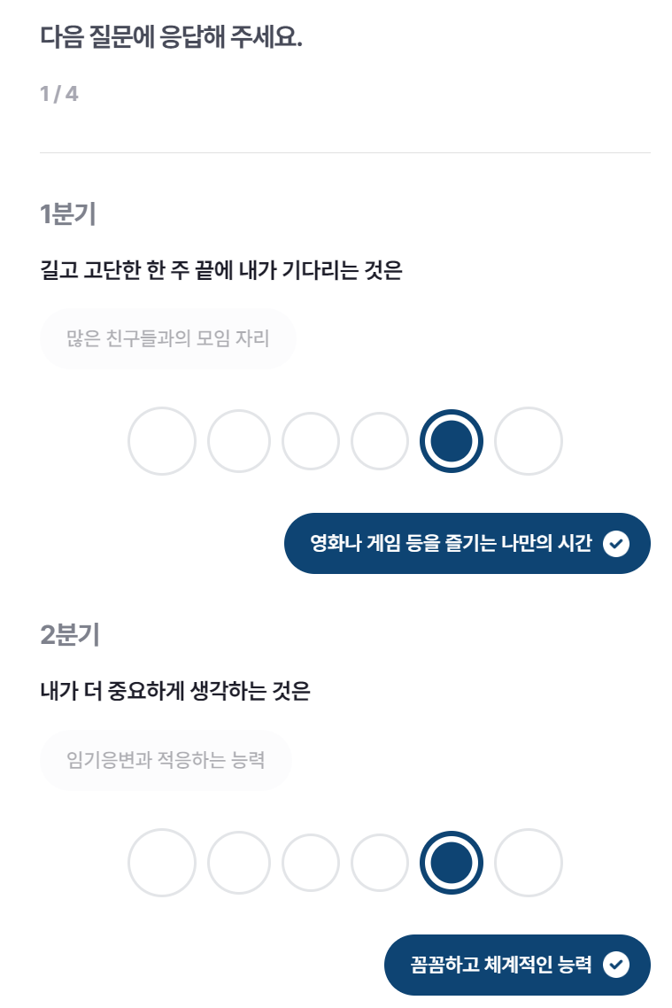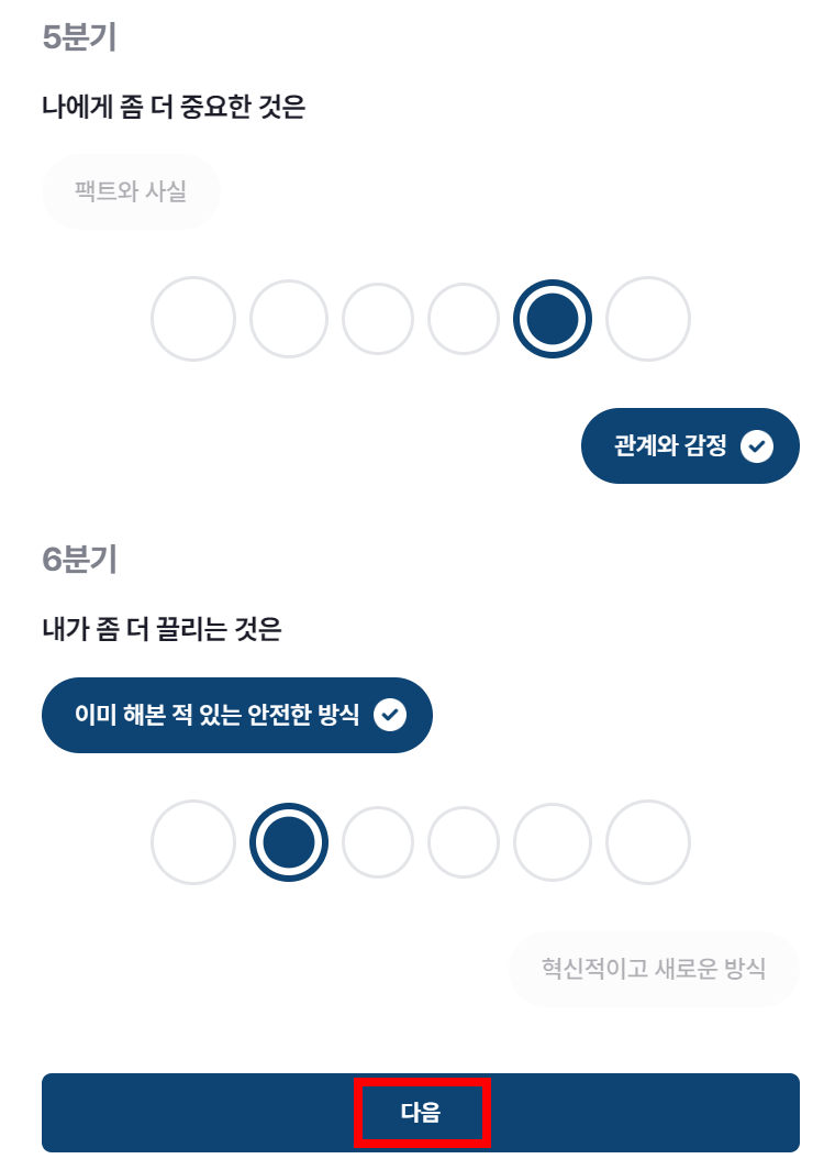 5분기의 문항은 나에게 좀 더 중요한 것은? / 6분기의 문항은 내가 좀 더 끌리는 것은?