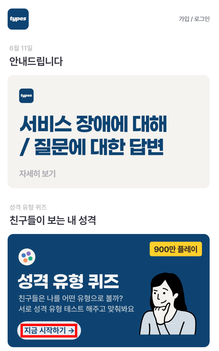 타입스(types) 홈페이지나 모바일앱을 통해서 들어가주며, 성격 유형 퀴즈 '지금 시작하기' 버튼을 눌러줍니다.