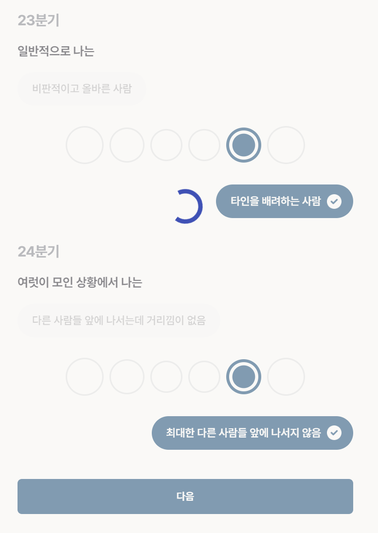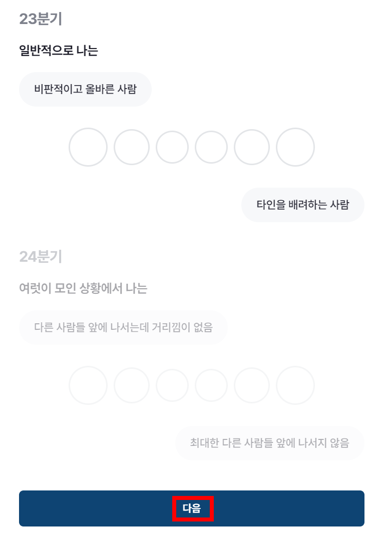 23분기의 문항은 일반적으로 나는? / 24분기의 문항은 여럿이 모인 상황에서 나는?