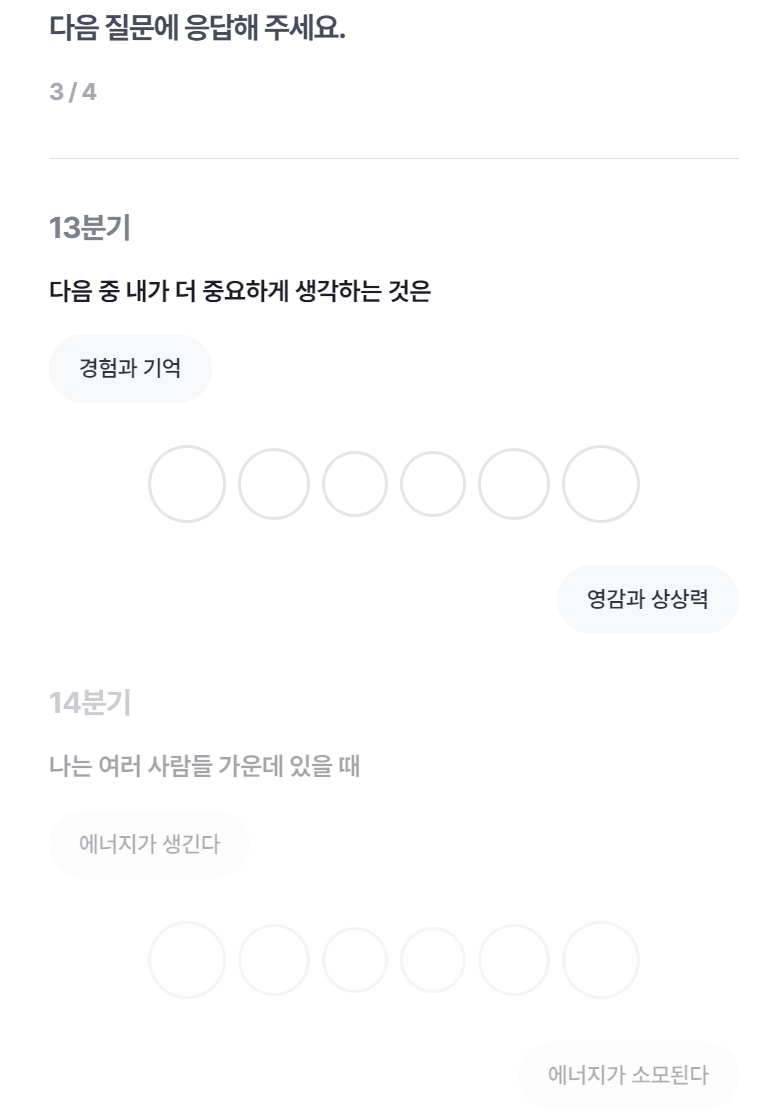 13분기의 문항은 다음 중 내가 더 중요하게 생각하는 것은? / 14분기 문항은 나는 여러 사람들 가운데 있을 때?