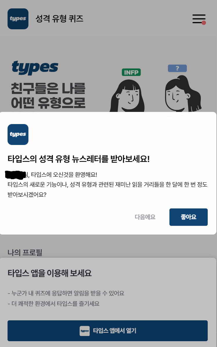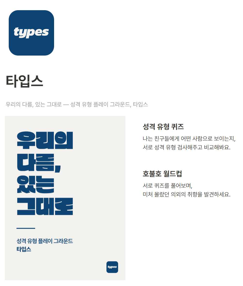 심심하실 때 타입스(types)앱을 설치하여 모바일을 통해서 재미 삼아 한 번 테스트를 해보셔도 되며, 성격 유형 퀴즈를 간단하게 테스트를 실시하실 수 있습니다.