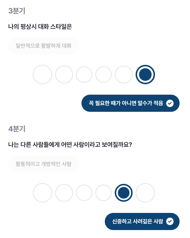 3분기의 문항은 나의 평상시 대화 스타일은? / 4분기의 문항은 나는 다른 사람들에게 어떤 사람이라고 보여질까요?