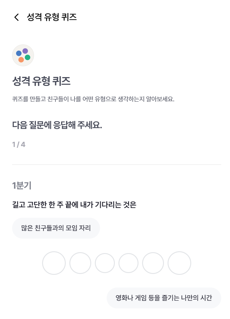 카카오 계정 약관에 동의를 하시고 성격 유형 퀴즈를 진행하시면 됩니다.