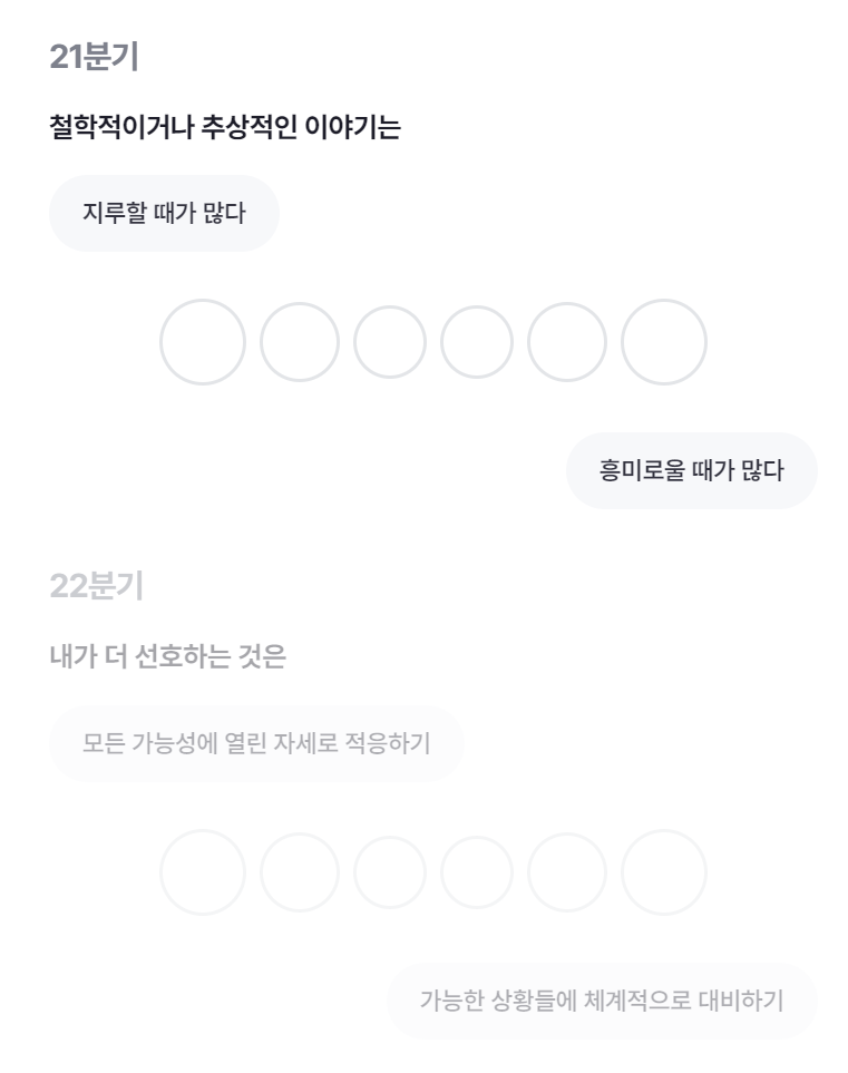 21분기의 문항은 철학적이거나 추상적인 이야기는? / 22분기의 문항은 내가 더 선호하는 것은?