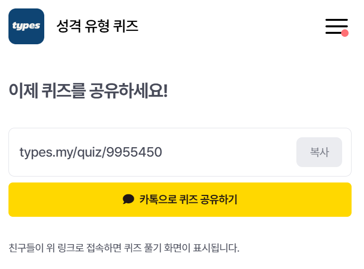 타입스의 성격 유형 검사는 친구에게 링크를 공유하는 기능이 있어서 카카오톡 공유를 하실 수 있습니다.