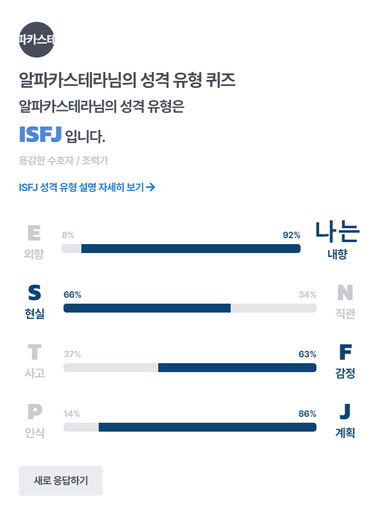 저는 ISFJ (내향, 현실, 감정, 계획)이 나왔습니다. ISFJ 각각의 성향이 몇 퍼센트까지 결과를 알아보실 수 있습니다.