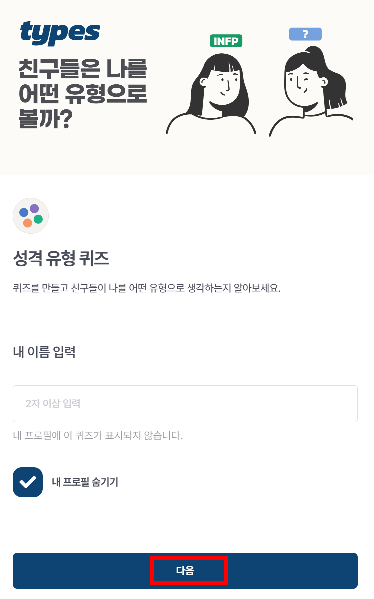 타입스의 성격 유형 뉴스레터를 받아보실 수 있으며, 성격 유형 퀴즈 '다음'을 클릭하여 성격유형퀴즈를 시작해보도록 하겠습니다.