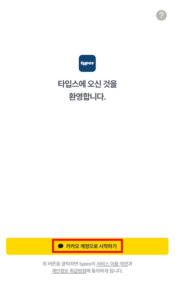 타입스에 오신 것을 환영합니다라는 창이 나오며, 카카오 계정으로 시작하기 버튼을 눌러줍니다.