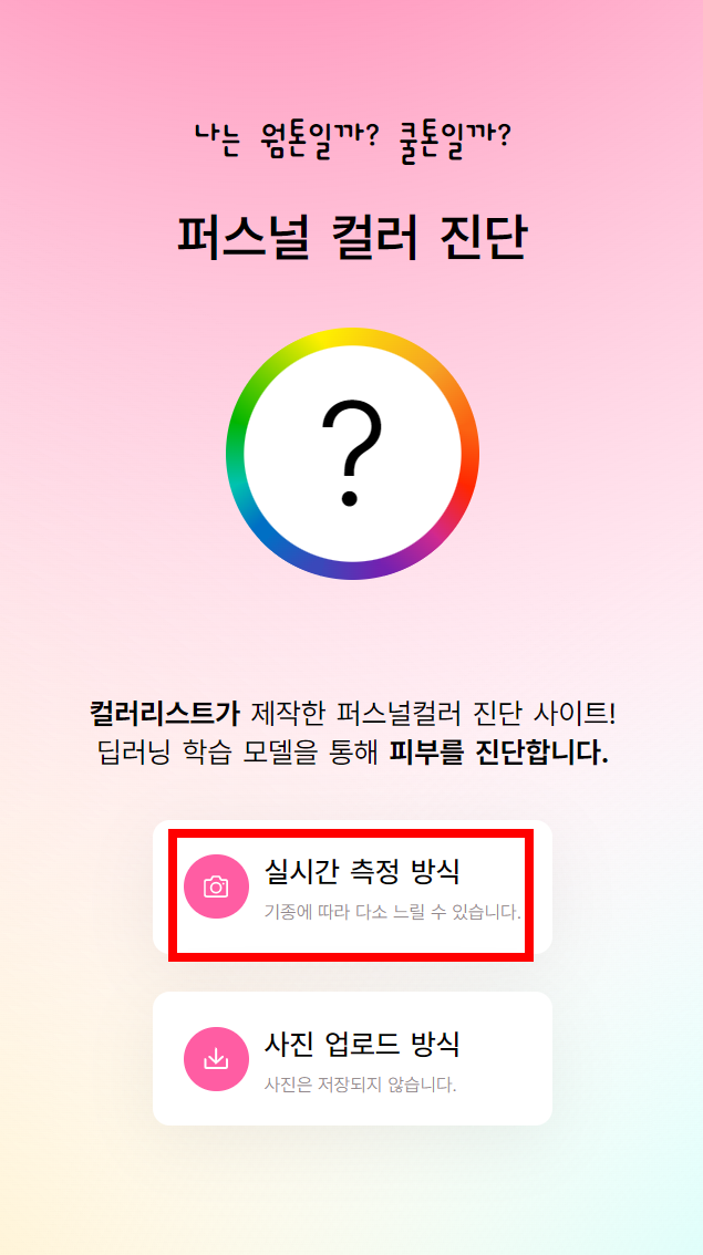 퍼스널 컬러 진단 사이트에 들어가셔서 '실시간 측정 방식'을 클릭해줍니다.