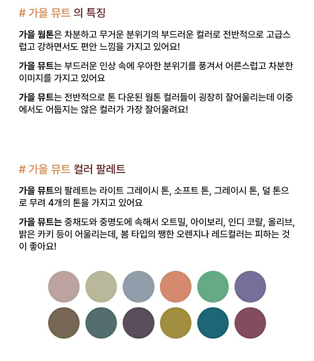 가을 뮤트는 4가지의 톤을 가지고 있으며, 오트밀, 아이보리, 인디 코랄, 올리브, 밝은 카키 등이 어울린다고 합니다.