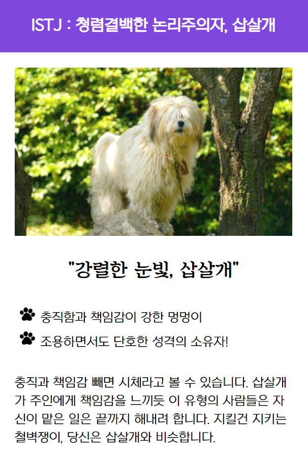 5. 시츄 (ESFJ) 6. 진돗개 (ESTJ) 7. 비숑 (ISFJ) 8. 삽살개 (ISTJ)