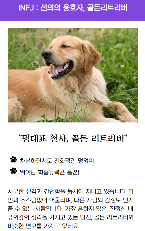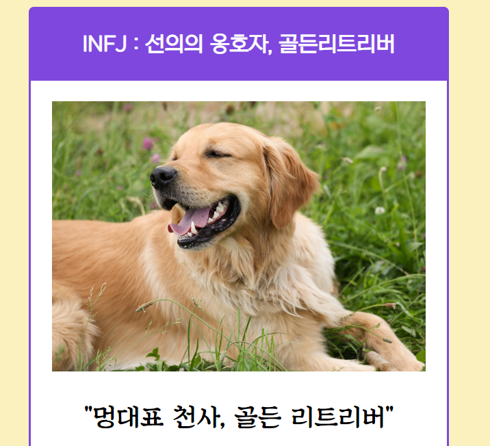 저의 강아지 테스트 MBTI는 INFJ: 선의의 옹호자, 골든 리트리버가 나왔습니다.
