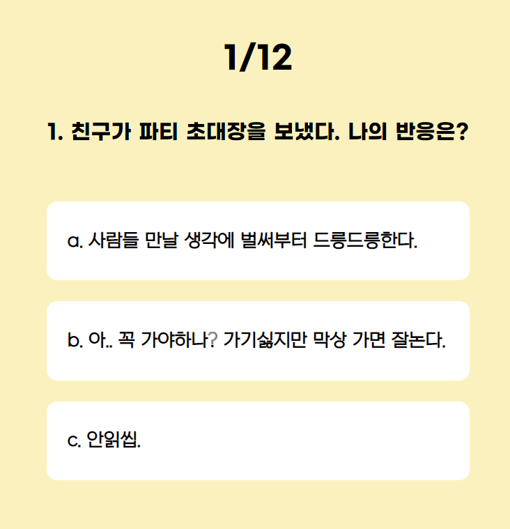 나의 Dog MBTI 테스트 문항 수는 총 12문제이며, 문제와 답 체크는 간단한 형식으로 되어 있어 본인에게 맞는 것을 체크하시면 됩니다.
