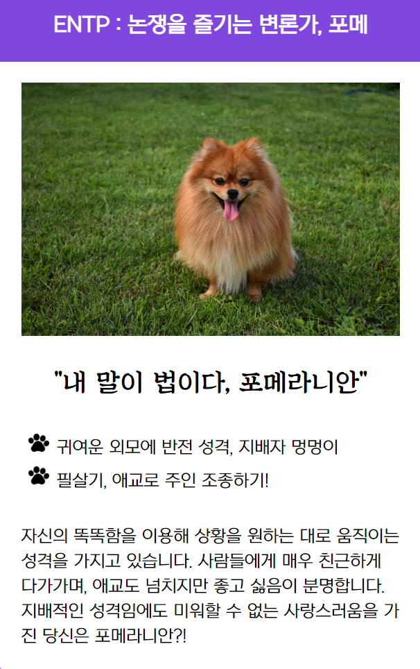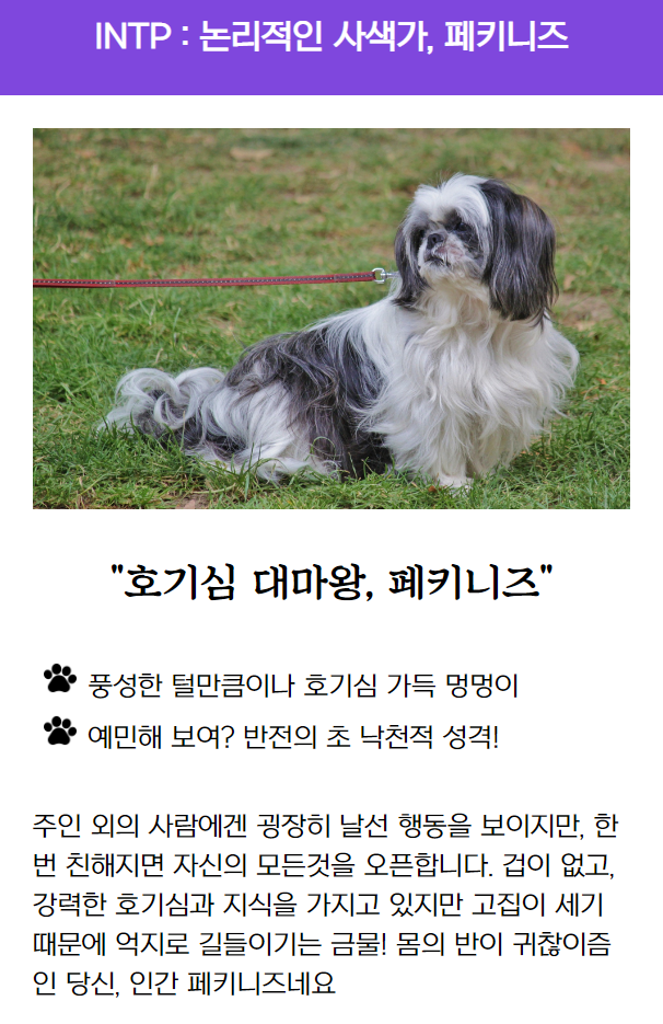 MBTI 성격 유형 검사하는 것을 좋아하는 분들에게는 강아지 테스트 MBTI를 재미 삼아 테스트를 해보셔도 됩니다.