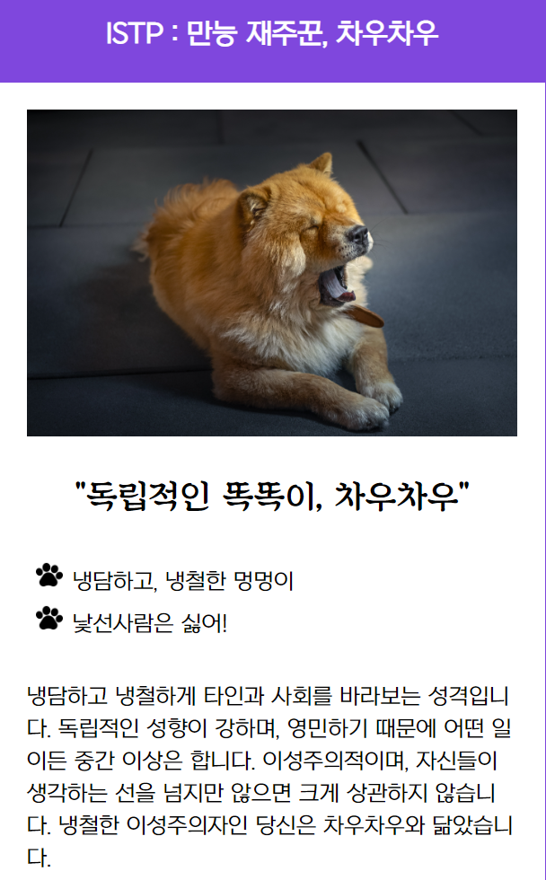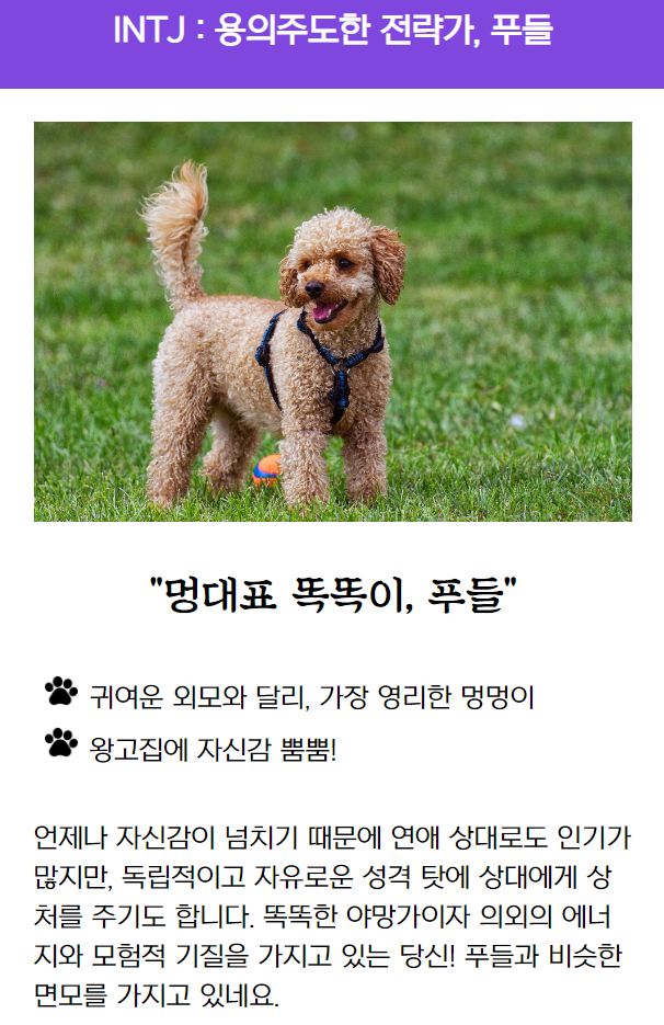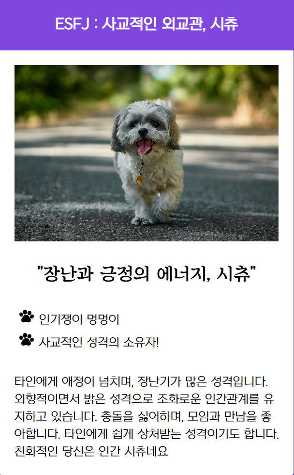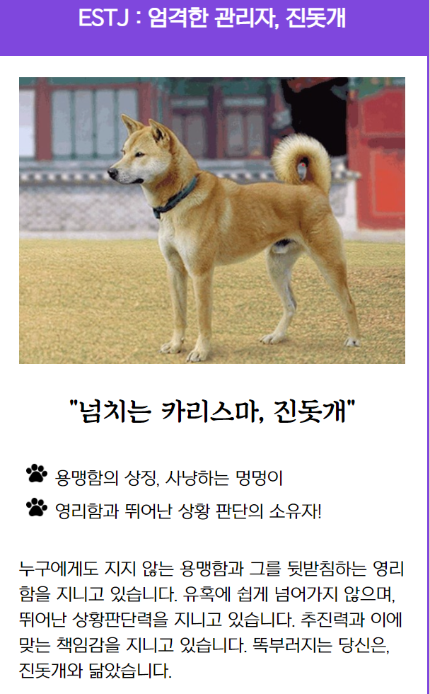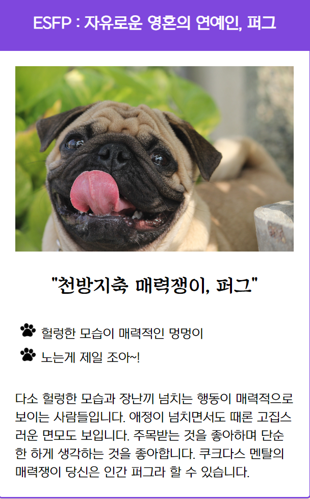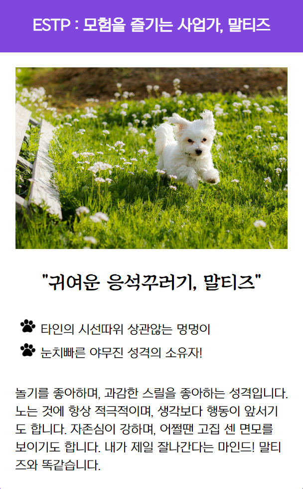 강아지 테스트 MBTI 검사 결과는 다음과 같습니다.