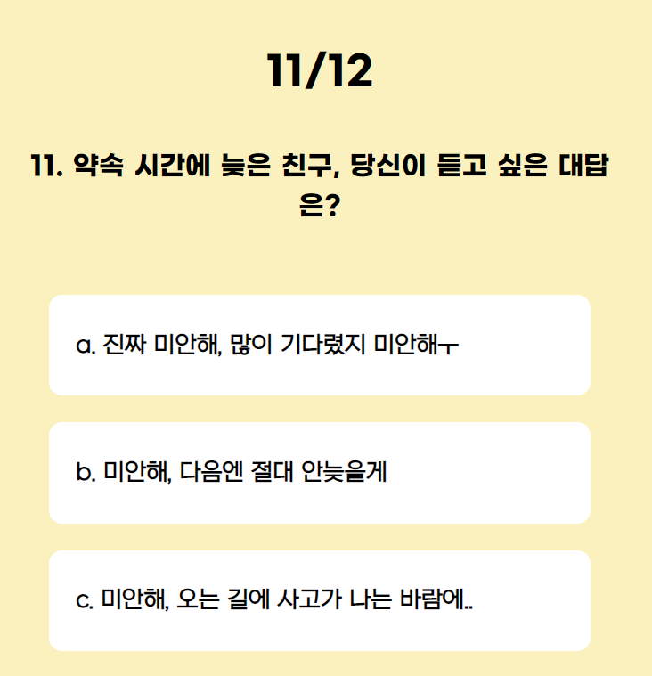 11. 약속 시간에 늦은 친구, 당신이 듣고 싶은 대답은?