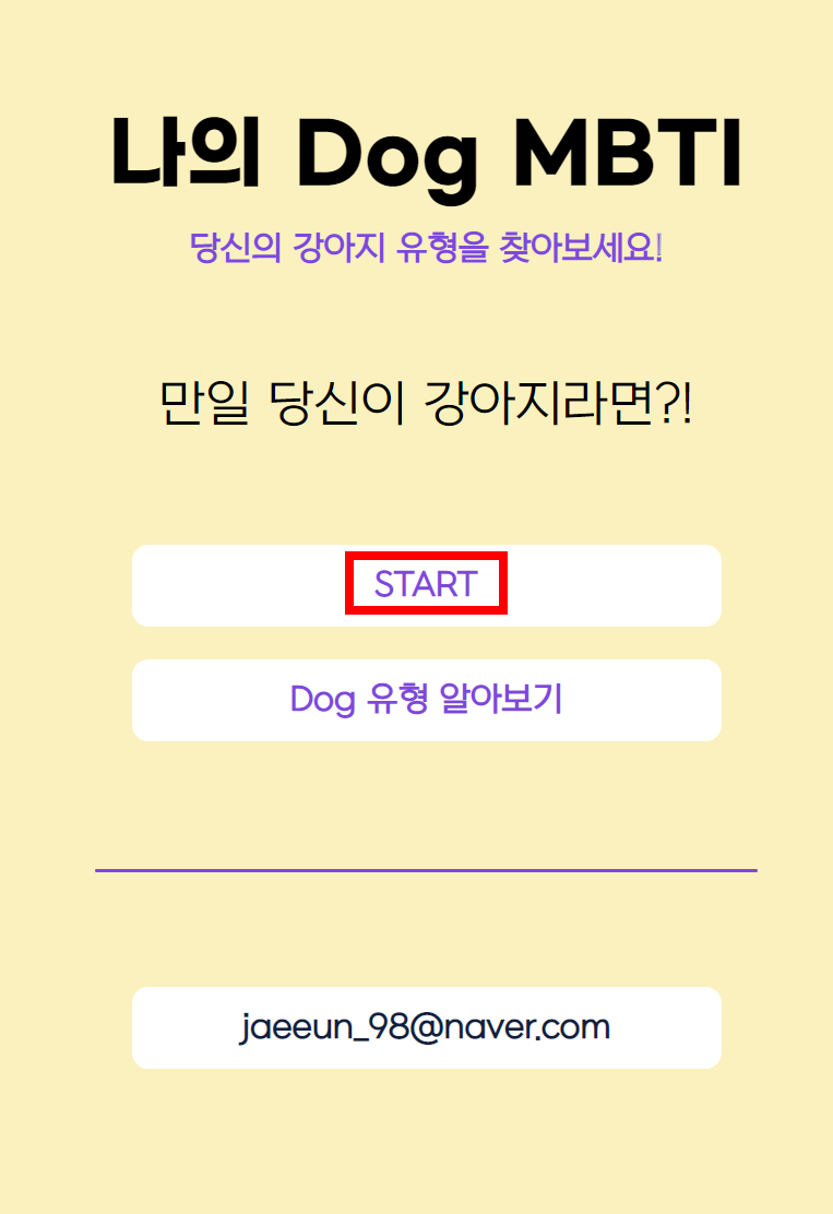 위의 강아지 테스트 MBTI 사이트에 들어가주셔서, 'START' 버튼을 눌러서 테스트를 시작하겠습니다.