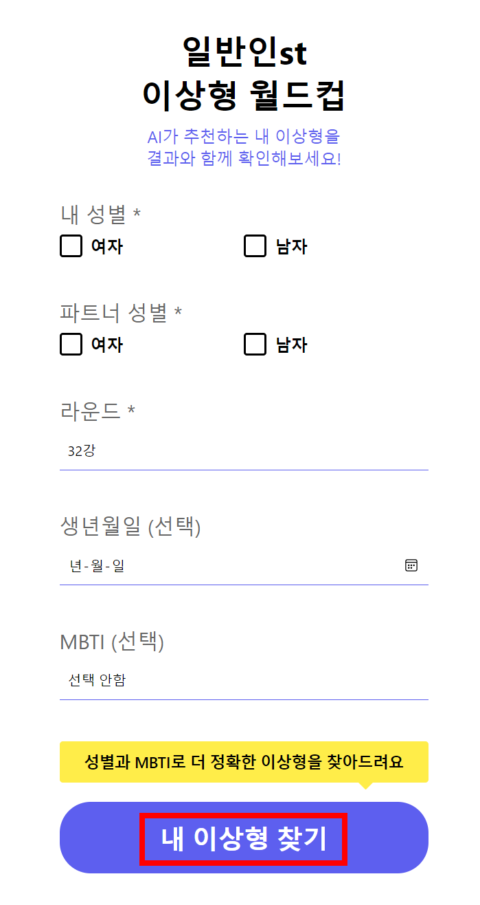 본인의 성별 및 파트너 성별, 라운드, 생년월일, MBTI를 입력하여 일반인st 이상형 월드컵을 실시하실 수 있습니다.