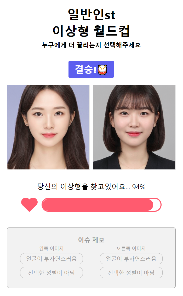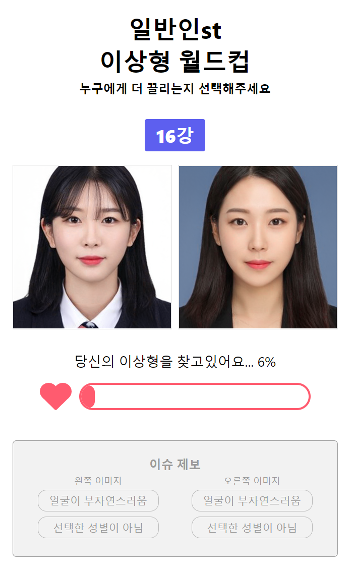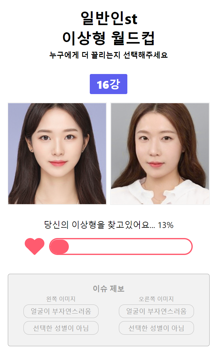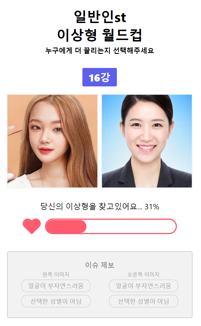 ↑ ↑ ↑ ↑ 위의 링크나 버튼을 통해서 일반인st 이상형 월드컵을 바로 시작하실 수 있습니다.